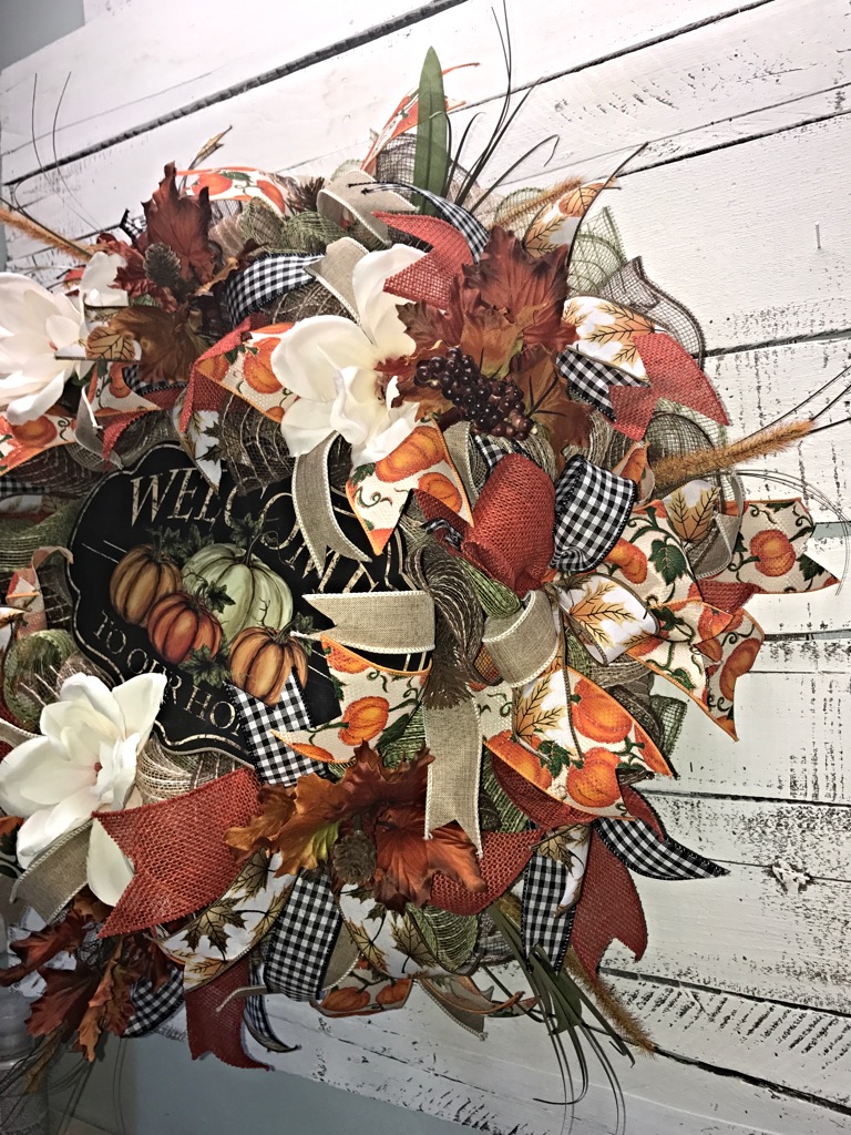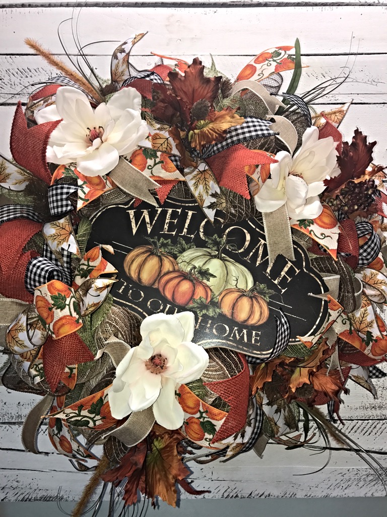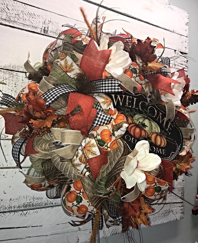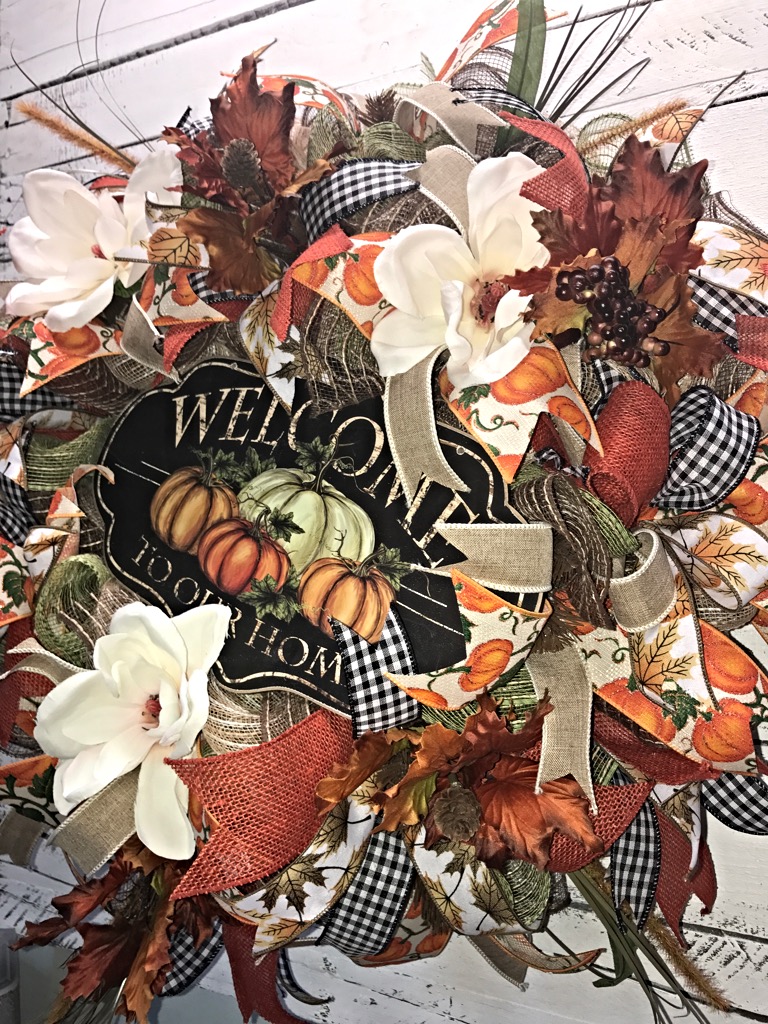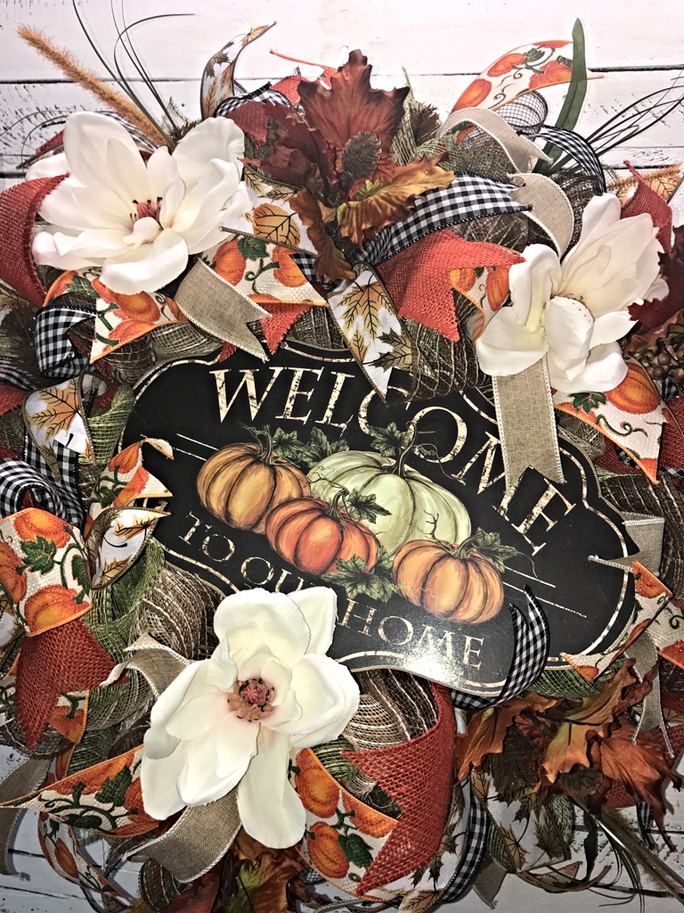 One of kind spectacular Fall wreath to dress up your front door for the Fall season! This magnificent Fall wreath is loaded with layers and layers of poly jute deco mesh and smothered in Fall accents and florals including hearty Magnolia blossoms, vibrant Fall leaf picks, yards and yards of Fall print ribbons and a beautiful wooden “Welcome To Our Home” sign to finish off this captivating design! This will stop people in their tracks to admire this extravagant masterpiece!